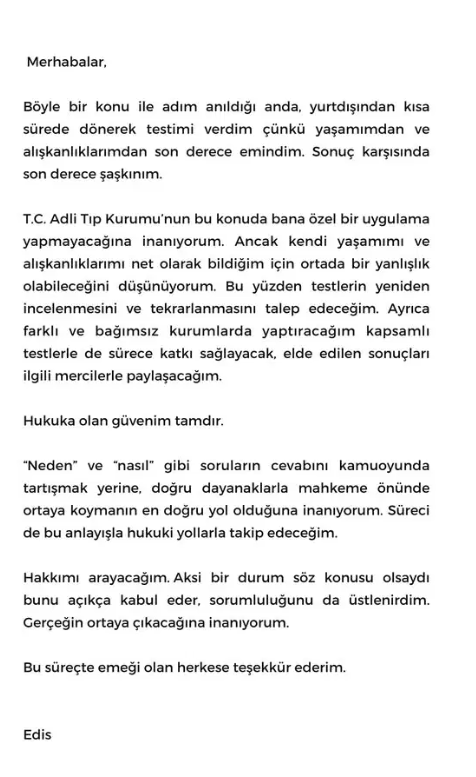 Ünlülere yönelik düzenlenen yasaklı madde soruşturması kapsamında gözaltına alınan ve test örnekleri veren Şarkıcı Edis Görgülü, test sonucunun pozitif çıkması sonra ilk kez açıklama yaptı.