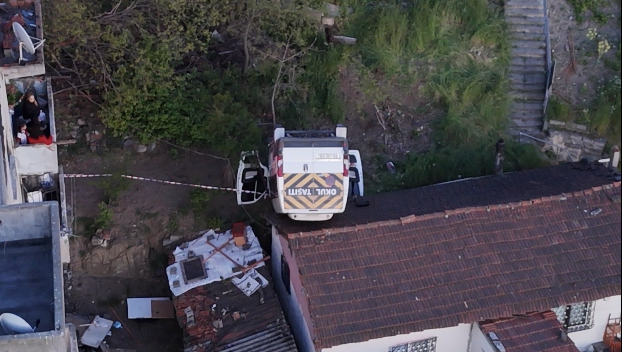 Okul servisinin çatısına düştüğü evde yaşayan İsmail Koç, “Minibüs duvara vurup, duvardan çatıya düşüyor. İçinde şoför yaralıydı inşallah birşeyi yoktur. Çok geçmiş olsun. Biz başkaları da var diye tedirgin olduk ama; çok şükür sadece şoför varmış. Olay sırasında biz dışarıda iş yerindeydik. Evde kimse yoktu, komşular bize haber verdi geldik. Allah beterinden saklasın” dedi.